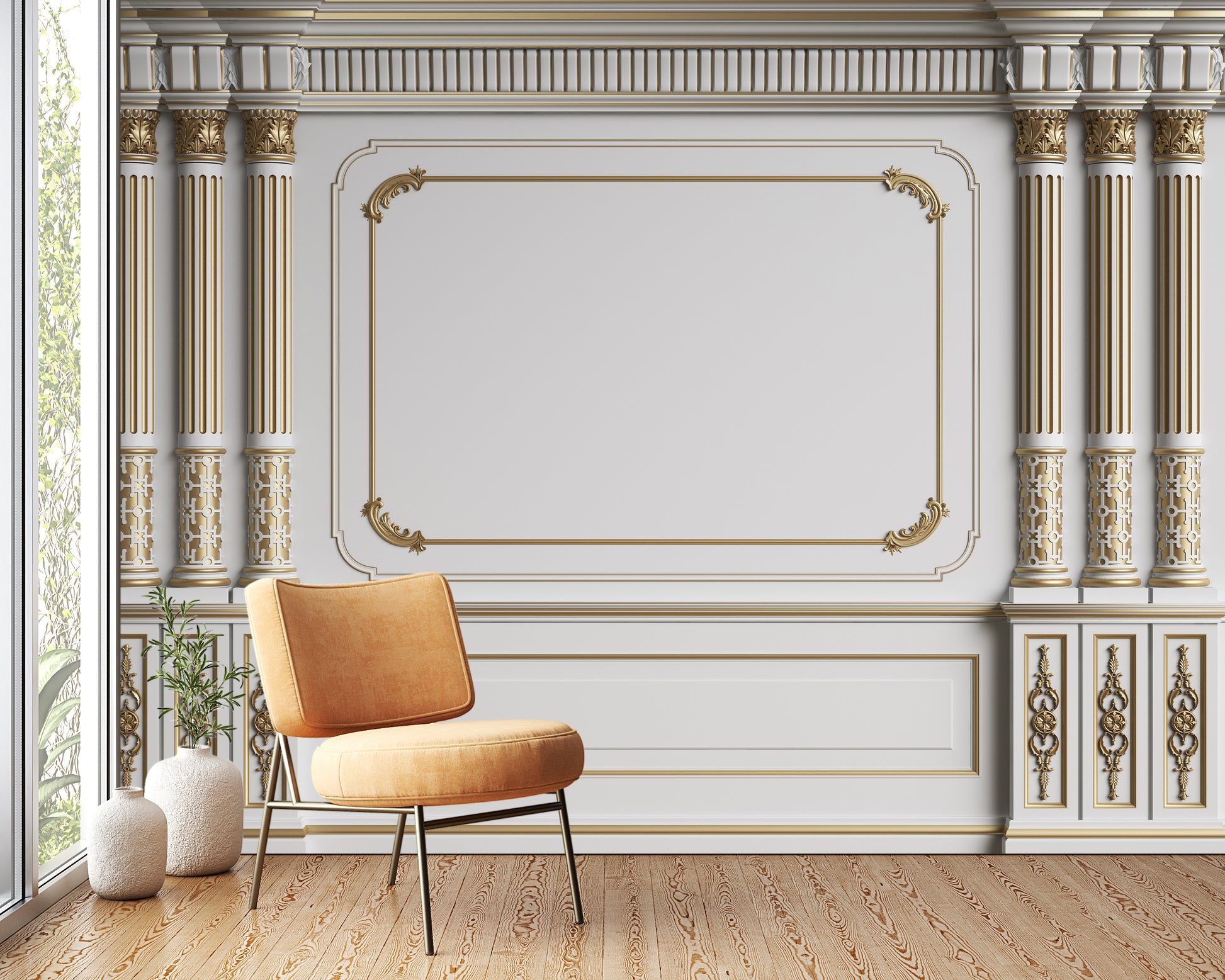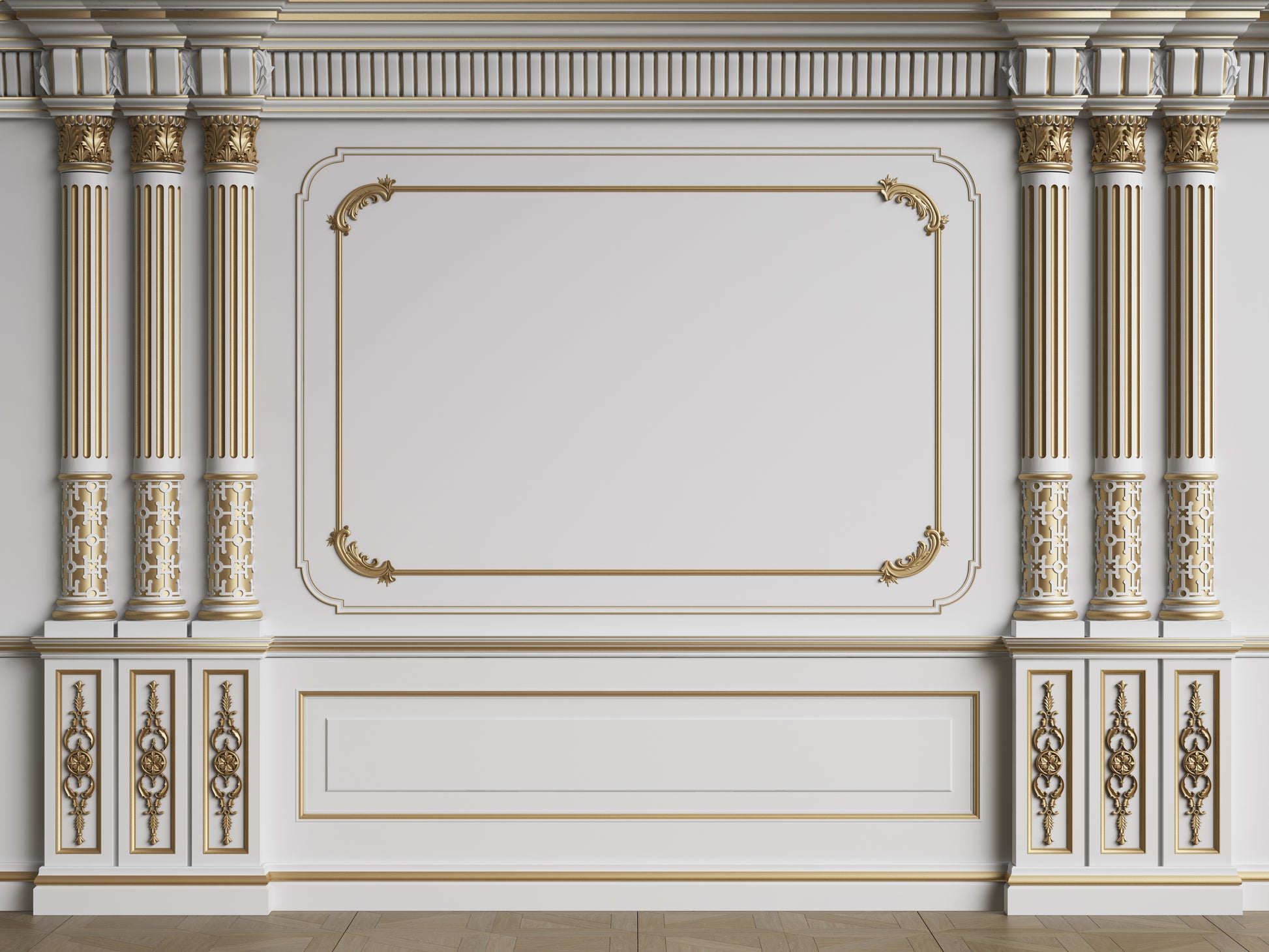 classic interior wall with mouldings floor parquet herringbone digital illustration 3d-rendering